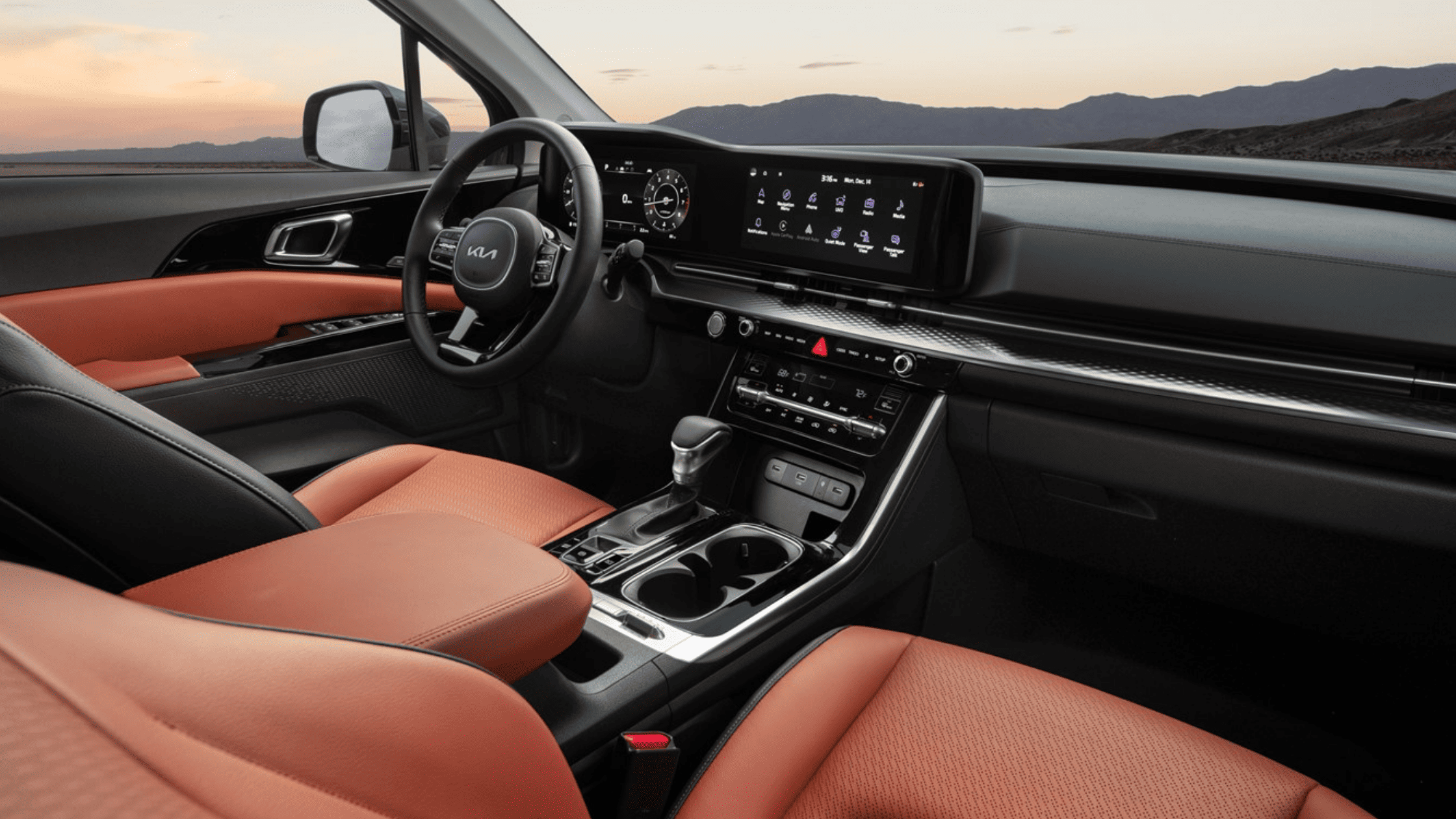 Entertainment and connectivity features in the 2024 Kia Carnival are designed with families in mind. The available dual-screen rear entertainment system provides streaming capabilities, while conveniently placed USB ports and power outlets allow passengers to keep devices charged throughout the drive. Kia’s infotainment system, displayed on a 12.3-inch touchscreen, makes navigation easy and includes Apple CarPlay® and Android Auto™ integration. This setup ensures that drivers stay connected and focused while passengers enjoy in-car entertainment.